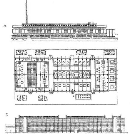 Рис. 1.12. Схематичные поперечный и продольный разрезы термического цеха автозавода 1.6. Архитектурный облик производственного зданияДля современных промышленных зданий характерен простой, удобный для монтажа, тектонический строй, простые архитектурные формы, высокий уровень комфорта в помещениях. Форма и объем здания в значительной степени предопределяются функционально-технологическими факторами, обусловливающими размер сетки колонн и этажность зданий, конструктивные особенности, вид освещения, воздухообмен. Выбор материала стен зависит от особенностей производства: наличия избыточных тепловыделений, агрессивности среды. Так, для объектов, выделяющих большое количество пыли и копоти, наружная поверхность стен должна быть гладкой, а для чистых производств может быть рифленой. Большинство современных зданий - каркасные, что не ограничивает форму и размеры остекленных поверхностей, служащих одним из элементов архитектурной композиции здания. Важным средством архитектурной композиции является членение фасадов здания на основе многократного повторения каких-либо планировочных или технологических особенностей, элементов технологического оборудования. Вынос за плоскость фасада лестничных клеток, входов, встроенных административно-бытовых помещений, вентиляционных шахт, отверстий и других элементов оживляет монотонность протяженных фасадов, обогащает композиционное решение и выявляет крупный масштаб здания. Промышленная архитектура формируется с учетом многих факторов, закономерностей и категорий: генерального плана, рельефа, площади, масштабности, пропорций, тектоники, симметрии и асимметрии, ритма и др. В последнее время для повышения выразительности архитектурного облика производственных зданий широко используются: применение вертикальных панелей наружных стен, что, однако, не является оптимальным для зданий с производственным процессом, требующим равномерного освещения; поиск пластики наружных панелей, выполнение их рельефными, с ребрами криволинейной формы, с разнообразной фактурой; поиск пропорций оконных проемов, выполнение их неленточными, деление крупных проемов на несколько мелких; использование цвета и фактуры материалов; применение различных форм световых фонарей с комплексным учетом климата, освещенности, вентиляции, прочих факторов. Производственные здания проектируют в соответствии со СНиП II-90-81 "Производственные здания промышленных предприятий". Для детальной проработки элементов фасада и достижения с их помощью определенной художественной выразительности фасад здания (или фрагмент фасада) выполняется в крупном масштабе.