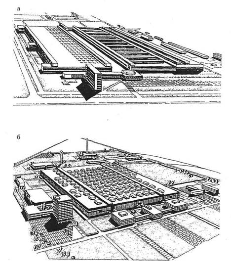 Рис. 1.14. Общий вид заводов: а - подшипникового; б - станкостроительного