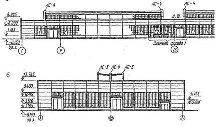 Рис. 1.15. Пример графического оформления фасадов одноэтажного здания: а - продольного; б - торцового
