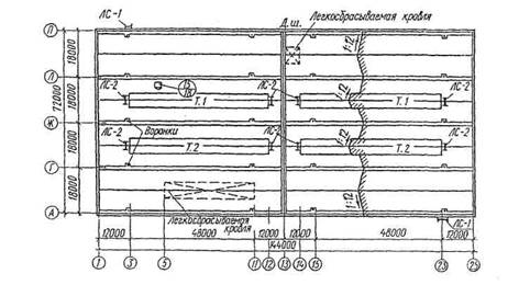 Рис. 1.16. Пример графического оформления плана кровли одноэтажного промышленного здания с внутренним водостоком-
