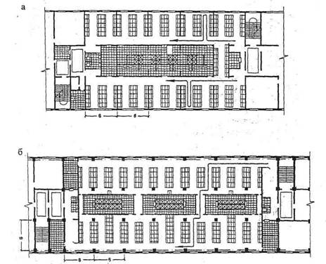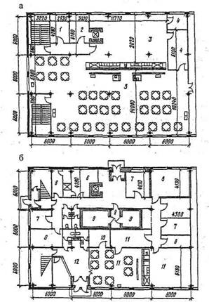 Рис. 2.6. Пример планировки столовой на 250 мест: а - план второго этажа; б - план первого этажа; 1 - помещение шеф-повара; 2 - доготовочная; 3 - кухня; 4 - мойки; 5 - обеденный зал; 6 - конторы и комнаты персонала; 7 - кладовая; 8 - вентиляционная камера; 9 - камера охлаждения; 10 - кабинет врача; 11 - диетстоловая; 12 - вестибюль Расчет гардеробных. Принимаем способ хранения всех видов одежды в закрытых шкафах с самообслуживанием. На каждого рабочего полагается шкаф для уличной одежды размерами 50×33 см без скамьи и двойной шкаф для домашней и рабочей одежды размерами 50×40 см со скамьей шириной 30 см, которые размещены в разных помещениях. Для мужчин - 336 шкафов для уличной и столько же для домашней и рабочей одежды; для женщин - по 144 шкафа каждого типа. Расчет душевых сеток делается по многочисленной смене, т. е. для 210 мужчин и 90 женщин по табл. 6 [1]. Для группы производств 2а полагается одна душевая сетка на 7 мужчин и 6 женщин. Количество сеток: для мужских душевых 210:7 = 30 шт., в женских душевых 90:6 = 15 шт. Умывальные рассчитываются также по многочисленной смене (табл. 7 [1]): для мужчин 210 : 20 = 11 шт., для женщин 90 : 20 = 5 шт. Расчет уборных: для мужчин 210:30 = 7 унитазов и 7 писуаров, для женщин 90 : 15 = 6 унитазов Курительные помещения: для мужчин 210×0,03 м2 = 6,3 м2, берем тип = 9,0 м2, для женщин - также 9,0 м2. Столовая. Количество посадочных мест принимается 1 на 4 работающих в многочисленной смене, т. е. 300:4 = 75 мест. По приведенной таблице состав и площади помещений столовой берем по столбцу, соответствующему наиболее близкому количеству мест - 100. При столовой следует устроить умывальники из расчета 1 умывальник на 15 мест (75 : 15 = 5 шт.). В уборной количество унитазов - 1 в мужской и 1 в женской. ИТР и служащие работают в одну смену, и часы обеденного перерыва у них не совпадают с рабочими, поэтому при расчетах их количество не принималось во внимание. Зал заседаний рассчитываем на 300 человек наибольшей смены: 300×0,9 м2 на одно зрительское место = 270 м2, фойе перед залом должно быть не менее 300×0,3 м2 = 90 м2. Туалеты для служащих и ИТР: всего 39 + 11 + 10 = 60 чел.; 60:15 = = 4 унитаза. Принимаем 3 унитаза в женском и 1 унитаз в мужском туалете. 2.4. Объемно-планировочное решение административно-бытового корпусаАдминистративно-бытовой корпус имеет разнообразные по функциональному назначению и объемно-планировочному решению помещения. В каждом из них свое размещение оборудования, свой температурно-влажностный режим, свои требования к освещенности. При проектировании АБК используется принцип формирования их из отдельных блоков гардеробно-душевых, административных помещений, столовой и конференц-зала. Архитектурный облик и формирование планировочной структуры корпуса в значительной мере зависят от средств архитектурно-планировочной взаимосвязи помещений. К ним относятся вестибюли и лестницы, коридоры и холлы, соединительные галереи. В здании должно быть не менее двух лестниц, устроенных по правилам пожарной безопасности. Главные лестницы, располагаемые обычно при главном вестибюле, имеют ширину марша большую, чем у служебных или вспомогательных лестниц, но не более 2,4 м. Ширина марша служебной лестницы - не менее 1,15 м. Ширина коридора проектируется не менее 1,8 м. Лестничные клетки, вынесенные за пределы основного объема здания, активно участвуют в формировании архитектурного облика последнего. Несмотря на различие функцио