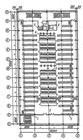 Рис. 2.2. Пример секционной планировки бытовых помещений автозавода: 1 - место для сушки волос и глажения одежды; 2 - мужской гардероб домашней и рабочей одежды на 1540 шкафов; 3 - ножные ванны; 4 - электрополотенца; 5 - вентиляционные шкафы