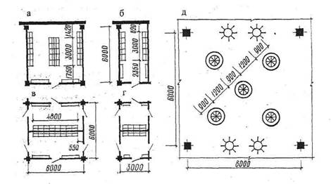 Рис. 2.4. Планировочные элементы умывален с оборудованием: а, в - размером 6×6 м; б, г - 6×3 м; д - с круглыми групповыми умывальниками Ширина проходов между рядами кабин, писуаров - 2 м при количестве в ряду 6 и более, 1,5 м - при меньшем количестве. Ширина проходов между рядом кабин и стеной или перегородкой - 1,3 м. Тамбур туалета может быть совмещен с умывальными. Тогда число умывальников принимается по расчету умывальных 10 человек в наибольшей смене на 1 кран. Помещения для сушки и обеспыливания рабочей одежды делаются обособленными, а при самообслуживании их располагают смежно с гардеробными для хранения рабочей одежды. Респираторные