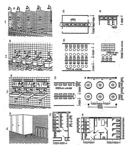 расчета 0,15 м2 на одного пользующегося респиратором. Рис. 2.5. Санитарно-техническое оборудование и элементы планировки умывальных, душевых, уборных: 1. а - общий вид душевых кабин; б- сквозные душевые кабины; г - закрытые душевые кабины; 2. а - общий вид ножных ванн; б - варианты их размещения; 3. а - общий вид настенных умывальников; б - варианты их размещения; в - пример размещения круглых групповых умывальников; 4. а - общий вид мужской уборной; б - пример размещения оборудования в мужской уборной; в - пример размещения оборудования в женской уборной с помещением для личной гигиены 2.3.4. Столовая Столовые, размещаемые на предприятии, являются доготовочными и работают на полуфабрикатах. Они обслуживают в основном только работающих на предприятии. Столовую рекомендуется размещать на первом этаже либо обеденный зал на этаже, ближайшем к уровню перехода между зданиями. Количество посадочных мест в столовой принимают из расчета 1 место на 4 человека, работающих в более многочисленной смене. Состав и площади помещений столовых определяют по СНиП II-Л.8-71 или по таблице. Состав и площади помещений столовых