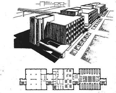 Рис. 2.8.. Административно-бытовой корпус электросталеплавильного цеха. Общий вид, план Все шире находят применение стеновые панели с развитой рельефной поверхностью, наружные несущие панели с развитой рельефной поверхностью, наружные несущие панели в виде решеток с глубоким рельефом и другие железобетонные элементы с декоративной обработкой. В данном курсовом проекте студентам предложено выполнить АБК из неполного каркаса со стенами из кирпича, что позволит, используя широкие возможности этого материала, создать фасады с интересной и богатой пластикой. 2.6. Состав проекта административно-бытового корпусаРасчетно-пояснительная записка выполняется в составе общей пояснительной записки к проекту цеха. Графическая часть состоит из не менее 4 планшетов форматом 75×55 см или 4 листов форматом А4. В составе графической части должно быть следующее: план первого этажа М: 1:100, 1:200; план типового этажа М: 1:100, 1:200: разрезы корпуса (продольный и поперечный) М: 1:100; конструктивные детали и узлы (не менее 5 узлов по согласованию с руководителями); главный фасад корпуса М: 1:100; боковые фасады М: 1:200. 2.7. Технико-экономические показатели проекта административно-бытового корпуса1. Полезная площадь здания, м2. 2. Площадь застройки, м2. 3. Строительный объем здания, м3. Технико-эконимические показатели следует поместить в пояснительную записку в заключительной ее части. Пояснительная записка должна быть аккуратно и прочно сшита, иметь обложку, оформленную по принятому образцу. Листы пояснительной записки должны иметь рамку со штампом, где дается название раздела и номер листа. БИБЛИОГРАФИЧЕСКИЙ СПИСОКРаздел 1 1. СНиП II-90-81. Производственные здания промышленных предприятий. - М. : Стройиздат, 1982 г 32 с. 2. СНиП II-2-80. Противопожарные нормы проектирования зданий и сооружений. - М.: Стройиздат, 1982. - 24 с. 3. ГОСТ 21.508-85. Генпланы - М.: Изд-во стандартов, 1986. - 16 с. 4. ГОСТ 21.501-80. Архитектурные решения. Рабочие чертежи. - М.: Изд-во стандартов, 1986 г 48 с. 5. Архитектурное проектирование промышленных предприятий / Под ред. С.Б. Демидова и А.А. Хрусталева. - М.: Стройиздат, 1984. - 286 с. 6. Архитектура промышленных зданий и сооружений: Справ, проектировщика / Под ред. Н.Н. Кима. - М.: Стройиздат, 1990 г. 440 с. 7. Архитектурная типология промышленных предприятий / Под ред. Н.С. Николаева, В.А. Мыслина, Е.С. Матвеева. - М.: Высш. шк., 1975. - 176 с. 8. Блохин В.В. Композиция в промышленной архитектуре-М.: Высш. шк., 1977. - 232 с. 9. Дятков С.В. Архитектура промышленных зданий. - М: Высш. шк., 1976. - 334 с. 10. Орловский Б.Я. Промышленные здания-М.: Высш. шк., 1975. Госстрой СССР. - 312 с. 11. Руководство по повышению архитектурно-художественного качества планировки и застройки предприятий машиностроения.- М.: Стройиздат, 1972 г. 84 с. 12. Сербинович П.П., Орловский Б.Я., Абрамов В.К. Архитектурное проектирование промышленных зданий. - М.: Высш. шк., 1972 г. 402 с. 13. Конструкции промышленных зданий / Под ред. А.Н. Попова. - М.: Стройиздат, 1979 г. - 304 с. 14. Шерешевский И.А. Конструирование промышленных зданий и сооружений. - Л.: Стройиздат, 1979. - 176 с. 15. Шубин Л.Ф. Архитектура гражданских и промышленных зданий. - М.: Стройиздат, 1977 г. 370 с. Раздел 2 1. СНиП II-92-76. Вспомогательные здания и помещения промышленных предприятий. - М.: Стройиздат, 1977 г. 42 с. 2. СНиП 2.09.04-87. Административные здания и помещения. - М.: Стройиздат, 1985 - 38 с. 3. СНиП II-Л-8-71. Предприятия общественного питания - М.: Стройиздат, 1972 
