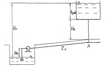 Для вычисления ординат характеристики трубопровода задаются рядом значений расходов, взятых с оси абсцисс графика характеристики насоса, и для каждого расхода вычисляются hвс.м, hвс.дл, hн.дл