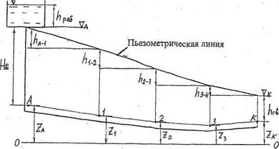 Обычно расчет начинают с концевой точки магистрали, наиболее удаленной от места расположения напорной башни. Отметка пьезометрической линии в этой точке равна (рис. 4) ÑK = ZK + hCB, где Zk - геодезическая отметка поверхности земли в концевой точке (узле);