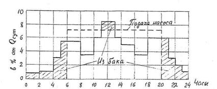 Аккумулирующий объем Wак определяется в зависимости от режима работы насосов и суточного ступенчатого графика потребления, на котором по оси абсцисс дано время в часах, а на оси ординат - часовой расход воды в процентах от суточного расхода. На рис. 5 приведен в качестве примера ступенчатый график водопотребления, совмещенный с подачей насоса, работающего в течение 14 часов (с 6 до 20 часов). Часовой расход насоса при этом составит 100 % / 14 = 7,14 % от суточного расхода. Заштрихованная площадь на графике соответствует аккумулирующему объему Wак в процентах от суточного расхода.