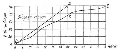 Аккумулирующий объем легко определить, совместив интегральную кривую расходов воды в процентах от суточного расхода, и кривую подачи насоса. Для данного примера примем, что начало координат соответствует 6 часам - началу работы насоса (рис. 6). Равномерная подача насоса изобразится прямой линией ОД, продолженной до конца работы в 20 часов с ординатой в 100 %. Ординаты интегральной кривой ОЕ равны сумме процентов с графика водопотребления, начиная с 6 часов и заканчивая суммирование через 24 часа, т.е. в течение суток. Наибольшая величина разности ординат прямой ОД и кривой ОЕ, т.е. отрезок ДК, соответствует аккумулирующему объему в процентах от суточного расхода. В данном примере ДК = 24 %, следовательно Wак = 0,24 Qcyт.