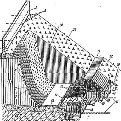 1 - насыпной грунт; 2 - водопроницаемый суглинок с прослойками и линзами песчаного грунта; 3 - водонесущий песчаный слой; 4 - водонепроницаемый суглинок; 5 - каменная ограда монастыря; 6 - устройство анкерных тяжей каменной ограды; 7...22 - позиции описаны в статье [2].