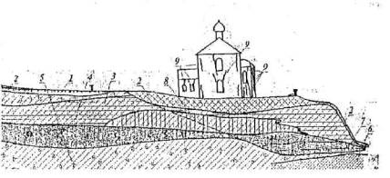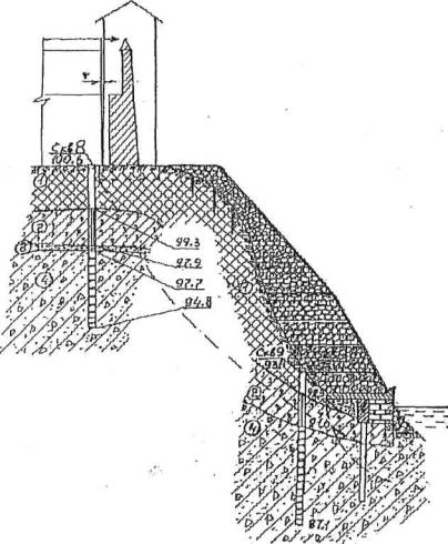 Монастырь также расположен на высоком левом берегу р. Каменка, размерами, обилием сооружений и сохранившимися каменными постройками XIV-XVI вв. представляет собой классический архитектурный ансамбль монастырского типа. Его мощная с 12 башнями и протяженностью около 1000 м крепостная стена подчеркивает завершенность и органическую целостность всего монастырского комплекса. На фоне схожести гидрогеологических условий е площадкой Васильевского монастыря основной причиной оползня, происшедшего весной 1994 г. на береговом склоне возвышенности в непосредственной близости от юго-западного участка крепостной стены Спас-Евфимиевского монастыря, стало обводнение грунта талыми водами, проникавшими с территории монастырского двора через песчаную линзу запасника погребенных развалин изразцовой мастерской, примыкавшей к крепостной стене и обнаруженной инженерно-археологическими изысканиями. Фильтрация под крепостную степу поверхностных талых вод по кольматационным водоупорам с выходом на откос береговой возвышенности способствовала обводнению грунтового массива по длине более чем на 50 метров и его оползневому сходу, создав ситуацию обрушения крепостных сооружений на этом участке [3]. Построенная гибкая гравитационная система противооползневых инженерных сооружений на этом участке ликвидировала аварию (рис. 4).