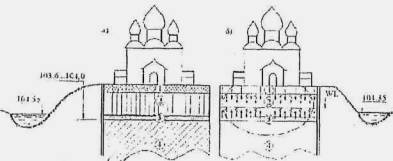 процессу резких перераспределений напряжений грунтовой толщи основания в условиях подтопления и их неравномерной деформации способствуют переменные динамические нагрузки, возникающие от движения тяжелого транспорта и техники автодорог, устроенных в непосредственной близости от здания собора в неблагоприятной зоне грунтовых оснований, подтопленных миграционными потоками подземных вод (с северной и восточной сторон);