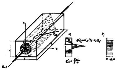 где 2.11. Железобетонные конструкции с арматурой в клеевой рубашке можно подвергать термовлажностной обработке до полимеризации клея. Время обработки не должно превышать 12 и 7ч при температуре изотермического прогрева соответственно 60 и 80°С, при этом прочность бетона конструкции достигает 70-80 % марочной. Расчет на действие температурных сил 2.12. При электронагреве арматуры, покрытой термореактивным клеем, в бетоне конструкции возникает нестационарное температурное поле, которое вызывает температурные напряжения, сжимающие на поверхности канала (вблизи арматуры) и растягивающие на периферии. Железобетонные конструкции с арматурой в клеевой рубашке должны быть рассчитаны на действие температурных сил, возникающих в бетоне на стадии натяжения арматуры. Расчет производят для двух сечений: сечение, нормальное к оси стержня (действует температурная сила Nzt) и сечение, проходящее через ось стержня по линии наименьшего сопротивления (действует сила Not). Расчет выполняют исходя из выбранного режима полимеризации клея.