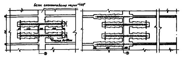 Рис. 4. Схемы армирования стыков плитных неразрезных пролетных строений арматурой в клеевой рубашке;
