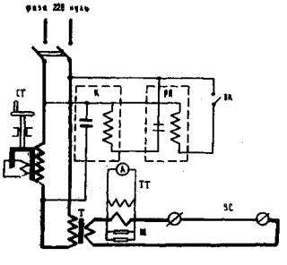 Рис. 5. Электросхема установки для нагрева арматуры 4.9. Стержни в цепь нагревательной установки подключают лишь с помощью специальных прижимных контактов, надежно соединенных с токоподводящими проводами. Токоподводящую часть контакта (длиной не менее 2 d) выполняют из металла, обладающего высокой электропроводностью (медь, латунь), а прижимающую часть - из обычной стали. Усилие прижатия контакта к нагреваемому стержню - не менее 100 кгс. 4.10. Напряжения в арматуре контролируют по силе тока, протекающего по стержню, используя зависимость между удлинением при заданной температуре и омическим сопротивлением стержня. Одновременно контролируют величину удлинения стержня. Операции при контроле напряжений в арматуре по силе тока выполняют в такой последовательности: в цепи нагреваемого стержня устанавливают трансформатор тока, подключенный к образцовому амперметру; производят тарировку стержней (минимум трех шт.), аналогичных заложенным в бетон, устанавливая величину коэффициента К1: