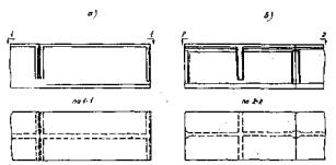Рис. 5 Первый вид расположения диафрагм повышает сохранность блоков при перевозке, предохраняя их от разрушения и усиливая наиболее напряженные части блоков - торцы. Размещение диафрагм посредине блока более экономично: количество диафрагм уменьшается в два раза; улучшаются условия доступа к стыкам при объединении балок, но при таком расположении диафрагм торцы блоков должны быть уширены по всему контуру на 1,5-2,0 см и армированы специальными сетками /рис. 6/.