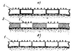 Рис. 1 Арматурные пучки в средних блоках могут размещаться: а/ раздельно в пазах, расположенных по нижней грани нижней полки, которая имеет общий вид гребенки; б/ по верхней грани нижней полки, снабженной бортиками, ограничивающими укладку бетона; в/ по верхней грани нижней полки, имеющей вертикальные выпуски стержней, которые после натяжения арматуры загибаются поперек пучков. Необходимо отдать предпочтение конструкциям с групповым расположением пучков по верхней грани нижней полки, омоноличивание которых выполняется обычным бетоном сверху вниз с уплотнением вибраторами. Омоноличивание открытых каналов, расположенных по нижней грани нижней полки, возможно только путем торкретирования раствором снизу вверх. Размещение напряженной арматуры в торцовых блоках производится в зависимости от типа пучков. Пучки с анкерами типа ЦНИИС МТС размещают в открытых каналах, расположенных в вутообразных утолщениях блоков. При применении пучков с конусными анкерными закреплениями в торцовых блоках устраиваются закрытые каналы /рис. 2/.