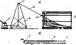 § 37. Установка опалубки и арматуры производится следующий образом: собранные заранее арматурные каркасы блоков сначала укладываются на поддон, а затем обставляются боковыми коробами и торцовыми щитами. Арматурные сетки плиты в некоторых случаях можно укладывать к концу бетонирования стенки блока. Для обеспечения проектного расположения стержней арматурной сетям плиты при вибрировании последняя так же, как в арматурная сетка усиления торцов блока, должна быть сварной конструкции. § 38. При бетонировании элементов через один форма собирается только для бетонируемых блоков, а в случае последовательного бетонирования боковые щиты устанавливаются для всей балки. Крайние торцовые щиты формы устанавливают в последнюю очередь. Перед их установкой к внутренней стороне поверхности щита прикрепляют металлические шайбы под анкера таким образом, чтобы эти шайбы легко отделялись от щита в момент распалубки. § 39. Для закрытых и открытых каналов, образуемых в теле блока, в торцовых щитах-кондукторах делают отверстия или прорези, в которых фиксируются концы каналообразователей. § 40. Для образования открытых каналов применяются металлические или деревянные шаблоны, извлекаемые из бетона после окончательной распалубки блоков. § 41. Для устройства закрытых каналов в бетоне торцовых блоков могут применяться стальные трубы и резинотканевые рукава. Одним из видов каналообразователей для закрытых каналов являются стальные трубы диаметром I" с надетой на них стальной оцинкованной плетенкой ПС0-40´55. § 42. До надевания плетенки трубы смазываются отработанным автолом. Концы труб, выходящие наружу, имеют захваты, при помощи которых они извлекаются из тела блоков. § 43. Каналообразователи из бетона блоков извлекаются лебедкой. Трос лебедки крепится к петле, которая находится на конце рукава или трубы. При криволинейной форме канала направление действия силы, приложенной к каналообразователю при его извлечении, должно совпадать с направлением касательной к каналу в месте его выхода из блоков /рис. 10/.