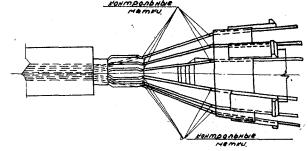 Рис. 14 Допускается натяжение прямых пучков и с одной стороны, но при длине балки не более 17 м. Другой конец пучка в этом случае заанкеривают вручную, забивая конусную пробку ударами кувалды по подбойнику до отказа. § 88. Конусные анкерные закрепления до начала натяжения пучков должны быть тщательно очищены от грязи, цементного раствора, ржавчины и масла. Очистку конического отверстия опорной шайбы рекомендуется выполнять наждачной бумагой. Конусные пробки и опорные шайбы окончательно обрабатываются бензином до получения чистой сухой поверхности. Во избежание насечки и обрыва проволок при натяжении пучков концы анкерных пробок должны иметь фаски в виде закруглений. § 89. Натяжение пучков домкратами двойного действия производится в два этапа: первый этап - выпрямление арматуры в канале /выборка слабины/; второй этап - натяжение арматуры. Окончание выборки слабины и начало натяжения соответствует усилию 3 т. К началу натяжения торец опорной головки домкрата должен плотно прижиматься к опорной шайбе. По окончании первого этапа /выпрямление арматуры/ на проволоки пучка следует нанести контрольные метки в местах выхода проволок из прорезей опорной головки и у передней грани клиновой обоймы /рис. 14/. Первые служат для измерения пучка при натяжении, вторые - для обнаружения проскальзывания отдельных проволок в клиньях. Натяжение и анкеровка пучков производятся в следующем порядке. При помощи насосной установки подают масло в главный цилиндр домкрата, плавно повышая давление до наибольшего монтажного усилия, превышающего расчетное на 10 %, и выдерживают на этом уровне 10 минут с последующим уменьшением давления до проектного. После этого производят запрессовку конусных пробок в анкерную шайбу путем подачи масла в цилиндр запрессовщика. Запрессовку следует производить с максимальным усилием, которое обуславливается предельным давлением масла для данного домкрата. Усилие запрессовки не должно быть менее 60 % силы натяжения и не должно превышать эту силу. При натяжении пучка двумя домкратами конусные пробки не рекомендуемся запрессовывать одновременно. В случае уменьшения усилия натяжения пучка после запрессовки первой конусной пробки одним из домкратов, что выявляется по манометру второго домкрата, заданная величина натяжения восстанавливается вторым домкратом. После запрессовки конусной пробки плавно сбрасывают давление в главном цилиндре домкрата, выбивает клинья из гневи клиновой обоймы и убирают домкрат. § 90. Концы натянутых пучков рекомендуется обрезать автогеном на расстоянии 3-5 см от торца анкерной пробки до инъектирования каналов. § 91. Натяжение пучков выполняется симметрично вертикальной оси балки. Первыми натягивают верхний и два нижних горизонтальных пучка, затем последовательно каждую пару пучков снизу и сверху и, наконец, центральную пару пучков. При последовательном напряжении арматуры необходимо создавать перенатяжение пучков, напрягаемых в первую очередь, учитывая упругое обжатие бетона и податливость стыков. Beличины перенатяжения пучков определяются по формуле, приведенной в приложении № 5. § 92. Натяжение пучков, проходящих в широких открытых каналах балок, пролетом более 30 м, необходимо производить с установкой ограничительных колодок-распорок между пучками. Эти распорки вынимаются при омонол