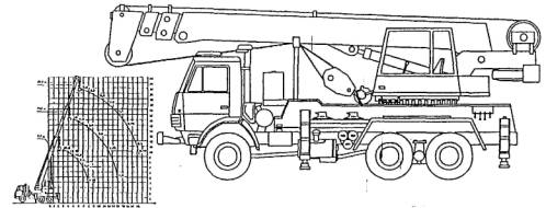 Автокран КС-55713-4 (шасси КАМАЗ-53228 6×6)Кран автомобильный КС-55713-4 грузоподъемностью 25 тонн предназначен для погрузочно-разгрузочных и строительно-монтажных работ на рассредоточенных объектах, в том числе и находящихся в труднодоступных местах с плохими подъездными путями. Крановая установка смонтирована на полноприводном шасси автомобиля КамАЗ-53228 с блокируемым межосевым дифференциалом, межколесной блокировкой и стабилизаторами поперечной устойчивости. Привод крановой установки - гидравлический от двух аксиально-поршневых гидронасосов. Гидравлическая система позволяет легко и плавно осуществлять управление крановыми механизмами и выносными опорами в широком диапазоне регулирования скоростей рабочих операций. Трехсекционная телескопическая стрела длиной 9,7-21,7 м обеспечивает компактность и маневренность крана при переездах, обширную зону и большую высоту подъема груза при работе. Для увеличения высоты подъема крюка и размера подстрелового пространства кран может комплектоваться решетчатым гуськом длиной 9 м, который крепится на оголовке стрелы. Система телескопирования стрелы включает в себя два гидроцилиндра выдвижения, благодаря чему обеспечивается независимость управления выдвижением-втягиванием каждой из двух подвижных секций. Возможность телескопирования стрелы с грузом на крюке позволяет крану устанавливать грузы в труднодоступных местах, пронося их среди смонтированных конструкций. Безопасную работу крана обеспечивает комплекс приборов и устройств, в том числе микропроцессорный ограничитель нагрузки с цифровой индикацией параметров на дисплее в кабине машиниста. Ограничитель нагрузки может работать в режиме координатной защиты крана и имеет встроенный прибор фиксации характеристик - «черный ящик». Спецификация Модель.............................................................КС-55713-4 Грузоподъемность максимальная, т / вылет, м.....25/3,2 Максимальный грузовой момент, т/м..........................80 Максимальная высота подъема крюка, м с основной стрелой 21,7 м..........................................21,9 с основной стрелой 21,7 м и гуськом 9 м..................30,0 Максимальная глубина опускания крюка стрелой 9,7 м..................................................до 12 Длина стрелы, м....................................................9,7-21,7 Длина гуська, м................................................................9 Скорость подъема-опускания груза, м/мин максимальная (кратность полиспаста 1).....................96 номинальная........(кратность полиспаста 8).................6 Скорость выдвижения-втягивания секций стрелы, м/мин......................................................3 Средняя скорость изменения вылета, м/мин............18,2 Скорость посадки груза, м/мин...................................0,3 Частота вращения поворотной части, об/мин........до 1,4 Скорость передвижения крана, км/час....................до 75 Масса крана в транспортном положении, т..............21,2 Размер опорного контура вдоль ´ поперек оси шасси, м....................................4,2´5,6 Габариты крана в транспортном положении, м длина-ширина-высота..................................12´2,5´3,7 Температура эксплуатации, °С........................от -40 до +40 Базовое шасси: Модель...................................................КАМАЗ-53228 Двигатель: Модель.................................................................7403 (740.11) Тип..............................................дизельный с турбонаддувом Максимальная мощность, л.с.(кВт), при 2600 (2200)об/мин............................260 (191), 240 (176) Изготовитель: ОАО «Галичский автокрановый завод» г.Галич