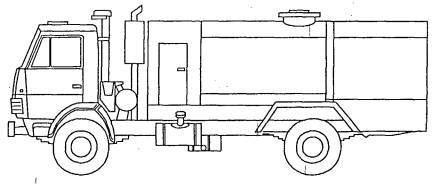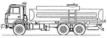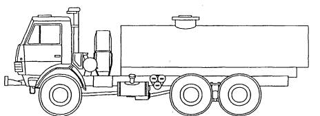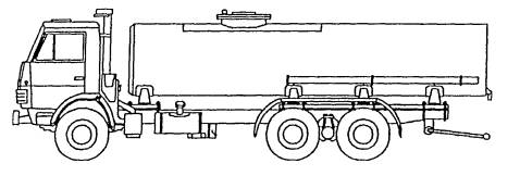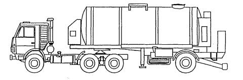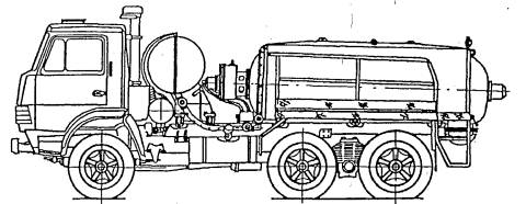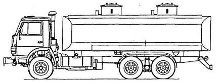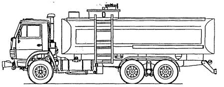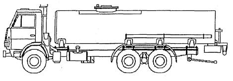 Автоцистерна 56151 (шасси КАМАЗ-43101 6´6)Автоцистерна предназначена для транспортирования и кратковременного хранения светлых нефтепродуктов плотностью не более 830 кг/м3 и рассчитана на эксплуатацию в тех же дорожно-климатических условиях, что и базовое шасси. Спецификация Модель........................................................АЦ-56151 Номинальная вместимость цистерны, л...........7800 Форма поперечного сечения цистерны......чемодан Количество отсеков в цистерне, шт........................1 Снаряженная масса, кг.......................................9200 Полная масса, кг, не более...............................15450 Габаритные размеры, мм, не более длина....................................................................7735 ширина.................................................................2500 высота..................................................................3110 Максимальная производительность насосной установки, л/мин.................................360 Привод насоса..........от коробки отбора мощности Максимальная глубина самовсасывания, м.......4,5 Время заполнения цистерны при помощи насоса, мин, не более.....................30 Время слива из цистерны, мин, не более при помощи насоса................................................30 самотеком...............................................................45 Максимальная скорость, км/ч...............................80 Базовое шасси Модель...............................................КАМАЗ-43101 Двигатель: Модель.................................................7403 (740.11) Тип..............................дизельный с турбонаддувом Максимальная мощность, л.с.(кВт), при 2600 (2200) об/мин............260 (191), 240 (176) Изготовитель: ОАО «ГРАЗ» п/о Грабово