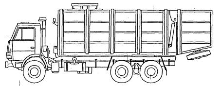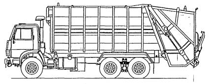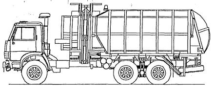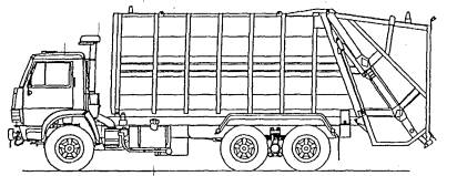 Мусоровоз кузовной КО-415А (шасси КАМАЗ-53213 6×4)Мусоровоз кузовной КО-415 А предназначен для механизированной погрузки твердых бытовых отходов из стандартных контейнеров в кузов, их уплотнения, транспортирования и механизированной выгрузки. Загрузка отходов производится с помощью манипулятора. Манипулятором осуществляется захват, подъем, опрокидывание, и установка контейнера на место. Рабочая зона манипулятора позволяет осуществлять загрузку нескольких контейнеров без перемещения машины. Перемещение мусора по ширине кузова для равномерного заполнения производится разравнивателем. Уплотняет мусор толкающая плита, перемещая его к задней крышке. Разгрузка кузова самосвальная. Пульт управления размещен с правой стороны мусоровоза. Привод рабочих органов гидравлический. Спецификация Модель...........................................................КО-415А Вместимость технологическая кузова, м3...........22,5 Масса загружаемых отходов, кг..........................9370 Грузоподъемность манипулятора, кг....................500 Рабочее давление в гидросистеме, Мпа.................12 Габаритные размеры, мм.................8700´2560´3600 Масса, кг специального оборудования................................4130 снаряженной машины........................................11130 полная..................................................................20500 Максимальная скорость, км/ч.................................90 Базовое шасси: Модель............................................КАМАЗ-53213 Двигатель: Модель........................................................7403 (740.11) Тип.....................................дизельный с турбонаддувом Максимальная мощность, л.с.(кВт), при 2600 (2200) об/мин...................260 (191), 240 (176) Изготовитель: ОАО «КОММАШ» г.Мценск