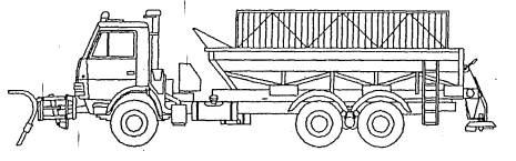 Машина комбинированная КО-823 (шасси КАМАЗ-53213 6´4)Машина уборочная универсальная КО-823 на шасси КАМАЗ-53213 и КАМАЗ-53229 предназначена для круглогодичного использования по содержанию дорог с асфальтобетонным и цементобетонным покрытием. В зависимости от комплектации спецоборудованием машина выпускается в следующих исполнениях: - КО-823-02 - с самосвально-распределяющим, плужным и щеточным оборудованием. Дополнительно по желанию заказчика машина может комплектоваться плужным -полускоростным, плужным - скоростным и плужным - грейдерным оборудованием; - КО-823-03 - с поливомоечным, плужным и щеточным оборудованием. Дополнительно по желанию заказчика машина может комплектоваться плужным - грейдерным, плужным - скоростным, плужным - полускоростным, распределяющим оборудованием; - КО-823-04 - с распределяющим плужным и щеточным оборудованием. Дополнительно по желанию заказчика машина может комплектоваться плужным - полускоростным, плужным - скоростным, плужным - грейдерным и поливомоечным оборудованием. Комплектация поставки определяется покупателем и может быть изменена в пределах, указанных в каждом исполнении в сторону дополнения или исключения отдельных механизмов по его требованию. Оборудование плужное - скоростное и плужное - полускоростное устанавливается только на шасси КАМАЗ-53229. В зимний период машина используется для очистки дорожного покрытия от свежевыпавшего и плотно слежавшегося снега, для посыпки инертными материалами или антигололедными реагентами поверхности дорожных покрытий, для перевозки снега или других сыпучих материалов. В летний период машина используется для мойки и поливки дорожных покрытий, прилотковой полосы, поливки зеленых насаждений, в качестве дополнительного средства при тушении пожаров и как подсобное средство при ремонтных работах на автомобильных дорогах. Спецификация Модель................................................................................КО-823 Модель шасси...........................КАМАЗ-53213....КАМАЗ-53229 Масса машины полная, кг..................20500...............21000 Ширина рабочей зоны, м: - плуга обычного....................................................................2,5 - плуга скоростного................................................................2,7 - плуга грейдерного..............................................................2,93 - плуга полускоростного......................................................2,95 - щетки.....................................................................................2,5 - самосвально-распределяющего........................................4 - 9 - при мойке..............................................................................8,5 - при поливке.........................................................................20,0 Рабочая скорость машины, м/сек (км/час), при работе: - скоростным плугом......................................................16,7 (60) - полускоростным плугом..............................................11,1 (40) - грейдерным плугом: - в летний период..............................................................8,3 (30) - в зимний период...........................................................11,1 (40) Отбрасывание снега на расстояние до, м.................................7 Масса воды, загружаемой в цистерну, кг...........11000 14000 Масса загружаемых сыпучих материалов в кузов, кг - самосвально-распределяющего оборудования......................................10150...................13400 - распределяющего оборудования....10800....................13800 Двигатель: Модель....................................................................7403 (740.11) Тип..................................................дизельный с турбонаддувом Максимальная мощность, л.с.(кВт), при 2600 (2200) об/мин...................................260 (191), 240 (176) Изготовитель: ОАО «КОММАШ» г.Мценск