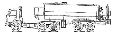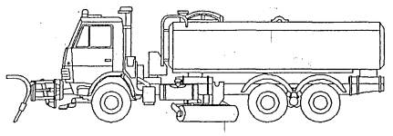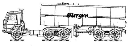 Автобитумовоз ДС-138Б (шасси КАМАЗ-53213 6´4)Автобитумовоз предназначен для транспортирования жидких битумных материалов с температурой до плюс 200°С с малыми потерями тепла, а также для перевозки других неагрессивных и взрывобезопасных жидкостей. Для расширения технологических возможностей автобитумовоз снабжен комплексом оборудования для распределения битума. Спецификация Модель..............................................................ДС-138Б Цистерна термоизолированная вместимостью, л..................................................10000 Снижение температуры битума, °С/час.....................4 Подогрев материала в цистерне:.................................. ......стационарными горелками на дизельном топливе Наполнение, опорожнение цистерны:......................... ..............наливом, самотеком или битумным насосом Время наполнения, опорожнения цистерны, мин............................................не более 25 Система распределения битума - ширина распределения, м......................................2,4 - норма разлива, л/м.......................................0,5 до 2,0 Месса снаряженная, кг..........................................9610 Габаритные размеры, мм - длина.....................................................................8680 - ширина..................................................................2500 - высота без груза...................................................2910 Максимальная транспортная скорость, км/час.......85 Базовое шасси: Модель..................................................КАМАЗ-53213 Двигатель: Модель.......................................................7403 (740.11) Тип.................................дизельный с турбонаддувом. Максимальная мощность, л.с. (кВт), при 2600 (2200) об/мин....................260 (191), 240 (176) Изготовитель: ЗАО «Кургандормаш» г.Курган
