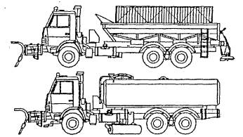 Машина комбинированная МДК-53213 (шасси КАМАЗ-53213)Машина дорожная комбинирована предназначена для круглогодичного использования по содержанию магистральных и городских дорог с твердым покрытием. Привод всех рабочих органов оборудования - гидромеханический. Управление транспортером - поворотом плуга вокруг вертикальной оси, его подъемом и опусканием, а также управление всеми рабочими органами оборудования осуществляется из кабины водителя. Применена усиленная цепная передача привода транспортера. На МДК-53213 с индексом С-00Щ устанавливается средний отвал для профилирования обочины и скалывания льда на дорожном покрытии; передний скоростной отвал, позволяющий производить скоростную уборку снега и отбрасывать его на 8-10 метров за пределы обочины. Спецификация Вместимость цистерны, куб. м.........................................9,5 Масса загружаемых материалов, кг..............................8000 Ширина рабочей зоны, м: при мойке...........................................................................8,5 при поливе........................................................................20,5 плужное оборудование .....................................................2,5 щеточное оборудование....................................................2,3 пескоразбрасывающее оборудование..................................................................4....9 передний скоростной отвал..............................................2,6 средний отвал....................................................................2,9 Удельный расход воды, (л/м2) при мойке...........................................................................0,7 при поливке.......................................................................0,2 Диапазон рабочих скоростей, (км/ч) при мойке.....................................................................10...20 при поливке.................................................................20...30 при посыпке........................................................................20 при уборке средним отвалом (летом)...........................................................20...40 (зимой)..........................................................................30...60 при уборке скоростным отвалом ......................................50 Базовое шасси: Модель...........................................................КАМАЗ-53213 Двигатель: Модель.................................................................7403 (740.11) Тип..............................................дизельный с турбонаддувом Максимальная мощность, л.с. (кВт), при 2600 (2200) об/мин ...........................260 (191), 240 (176) Изготовитель: ЗАО «Смоленский автоагрегатный завод» г. Смоленск
