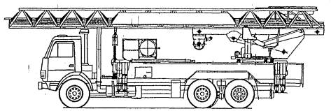 Автолестница пожарная АЛ-50 (шасси КАМАЗ-53229 6´4)Автолестница пожарная предназначена для: - обеспечения эффективного проведение спасательных, аварийно-восстановительных работ и тушения очагов пожара на высоте; - доставки к месту проведения спасательных, восстановительных работ боевого расчета и необходимого пожарно-технического вооружения (ПТВ) и оборудования; - подъем боевого расчета, ПТВ и оборудования на высоту; - подача огнетушащих веществ с высоты; - эвакуация людей с высоты при помощи лифта или эластичного спасательного рукава. Спецификация Модель.........................................................АЛ-50 Высота лестницы, м..........................................51 Максимальная нагрузка на вершину не прислоненной лестницы, кг......................300 Грузоподъемность люльки, кг.......................200 Грузоподъемность лифта, кг..........................200 Рабочий вылет вершины лестницы, м............16 Габаритные размеры, мм: длина............................................................11000 ширина...........................................................2500 высота............................................................3580 Полная масса, кг.........................................15800 Максимальная скорость, км/ч.........................80 Базовое шасси: Модел.............КАМАЗ-53229 или КАМАЗ 53228 Двигатель: Модель...............................................7403 (740.11) Тип............................дизельный с турбонаддувом Максимальная мощность, л.с. (кВт), при 2600 (2200) об/мин..........260 (191), 240 (176) Изготовитель: ОАО «Пожтехника» г. Торжок