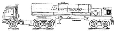 Полуприцеп-цистерна транспортная ППЦ-9627-020 (тягач КАМАЗ-54115 6´4)Полуприцеп - цистерна транспортная предназначена для транспортирования, кратковременного хранения светлых нефтепродуктов плотностью не более 740 кг/м3 и рассчитана на эксплуатацию в тех же дорожно-климатических условиях, что и базовые полуприцеп и тягач. Спецификация Модель...................................................................ППЦ-9627-020 Базовое шасси полуприцепа.................................................9370 Номинальная вместимость цистерны, л............................17000 Форма поперечного сечения цистерны.........................чемодан Количество отсеков в цистерне, шт........................2 (по 8500 л) Снаряженная масса полуприцепа, кг.................................5500 Полная масса полуприцепа, кг, не более.........................19100 Нагрузка на седельное устройство тягача, кг....................8100 Габаритные размеры полуприцепа-цистерны, мм - длина...................................................................................7345 - ширина................................................................................2500 - высота.................................................................................2550 Привод насоса* - от коробки отбора мощности тягача Максимальная производительность насоса, л/мни.........................................................................400 Время слива из одного отсека цистерны с помощью насоса, мин, не более............................................24 Время заполнения одного отсека цистерны, мин................24 Время слива самотеком, мин, не более.................................35 Максимальная скорость, км/ч................................................80 *Примечание: насос устанавливается дополнительно по требованию заказчика, при условии поставки тягача. Тягач: Модель..............................................................КАМАЗ-54115 Двигатель: Модель.................................................................7403 (740.11) Тип..............................................дизельный с турбонаддувом Максимальная мощность, л.с.(кВт), при 2600 (2200) об/мин...........................260 (191), 240 (176) Изготовитель: ОАО «ГРАЗ» п.Грабово