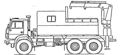 Агрегат 3 АРОК (АРК-СК) (шасси КАМАЗ 43101 6´6)Агрегат предназначен для ремонта и технического обслуживания оборудования и нефтегазодобывающей и других отраслях промышленности. Состав оборудования: - система масловыдачи для замены масла в редукторах станков-качалок и механизированной смазки узлов консистентной смазкой; - отапливаемая кабина кузова; - оборудование для производства электрогазосварочных работ; - инструмент и принадлежности для проведения ремонтных работ. Особенности конструкции: - шасси с высокой проходимостью; - автономный источник питания переменного тока напряжением 380 В и 220 В (генератор 30 кВт); - слесарная мастерская; - комплект окрасочного оборудования. Спецификация Модель..........................................................3 АРОК (АРК-СК) Грузоподъемное устройство: .......................................................гидроманипулятор ЛB - 184 Грузовой момент, кНм, не менее (при Рном = 16 МПа).....43 Максимальный вылет стрелы манипулятора, м....................6 Грузоподъемность, кг: при вылете 6 м...............................880 при вылете 3 м.............................1760 Угол поворота стрелы, градус........................................до 400 Масса периодически перевозимого груза, кг.............до 2000 Масса агрегата, кг: - снаряженная....................................................................13225 - комплекта.......................................................................15450 Габаритные размеры, мм: - длина.................................................................................8500 - ширина..............................................................................2500 - высота...............................................................................3950 Максимальная скорость, км/час..........................................80 Базовое шасси Модель..............................................................КАМА3-43101 Двигатель: Модель.................................................................7403 (740.11) Тип..............................................дизельный с турбонаддувом Максимальная мощность, л.с. (кВт), при 2600 (2200) об/мин.............................260 (191), 210(176) Изготовитель: ЗАО «Озониг-Лукойл» г.Октябрьский