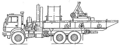 Транспортное средство для перевозки оборудования УЭЦН (СТЭК) (шасси КАМАЗ-43118 6´6)Транспортное средство для перевозки оборудования УЭЦН (СТЭК) изготовлено на шасси повышенной проходимости КАМАЗ-43118, к раме прикреплена платформа для размещения оборудования установок электропогружных центробежных насосов (погружного насоса, электродвигателя с гидрозащитой, намотанного на барабан и кабеленаматывателя на санях). На платформе установлен кран-манипулятор для погрузки и разгрузки оборудования. В задней части рамы шасси прикреплена лебедка с приводом от двигателя шасси для подтягивания груза из труднодоступных зон и самовытаскивания транспортного средства. Спецификация Модель...................................................................................УЭЦН (СТЭК) Грузоподъемность, кг, не более...........................................................8000 Снаряженная масса, кг, не более.......................................................13537 Полная масса, кг..................................................................................20560 Манипулятор гидравлический............................................."МКС-5531А" - грузовой момент, кНм, не менее......................................................105,3 - максимальная грузоподъемность, кг.................................................5000 - вылет стрелы при максимальной грузоподъемности, м....................1,83 - максимальный вылет, м.........................................................................7,9 - грузоподъемность, кг: на вылете 3,4 м.......................................................................................3200 на вылете 4,5 м.......................................................................................2300 Приспособление для перевозки кабеленаматывателя........................................................................имеется Габаритные размеры, мм:................................................9500´2500´3950 Базовое шасси: Модель...................................................................................КАМАЗ-43118 Двигатель: Модель......................................................................................7403 (740.11) Тип...................................................................дизельный с турбонаддувом Максимальная мощность, л.с. (кВт), при 2600 (2200) об/мин.................................................260 (191), 240 (176) Изготовитель: ООО «Автотрейд» г. Набережные Челны.