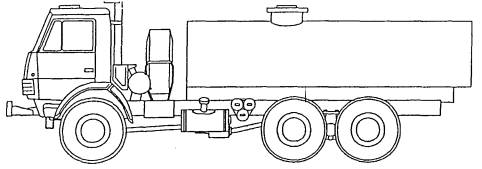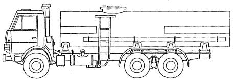 Автотопливозаправщик 56152 (шасси КАМАЗ-43101 6´6)Автотопливозаправщик предназначен для транспортирования, кратковременного хранения и заправки автотехники светлыми нефтепродуктами плотностью не более 830 кг/м3 и рассчитан на эксплуатацию в тех же дорожно-климатических условиях, что и базовое шасси. Спецификация Модель................................................................АТЗ-56152 Номинальная вместимость цистерны, л.....................7800 Форма поперечного сечения цистерны................чемодан Количество отсеков в цистерне, шт..................................1 Снаряженная масса, кг.................................................9200 Полная масса, кг, не более.........................................15450 Габаритные размеры, мм, не более длина..............................................................................7735 ширина...........................................................................2500 высота.............................................................................3110 Максимальная производительность насосной установки, л/мин.............................................360 Привод насоса......................от коробки отбора мощности Дозировка выдачи......................................................ручная Максимальная глубина самовсасывания, м ..................4,5 Время заполнения цистерны при помощи насоса, мин, не более .................................30 Время слива из цистерны, мин, не более при помощи насоса............................................................30 самотеком...........................................................................45 Максимальная скорость, км/ч...........................................80 Базовое шасси: Модель...........................................................КАМАЗ-43101 Двигатель: Модель..............................................................7403 (740.11) Тип ..........................................дизельный с турбонаддувом Максимальная мощность, л.с.(кВт), при 2600 (2200) об/мин.........................260 (191), 240 (176) Изготовитель: ОАО «ГРАЗ» п/о Грабово