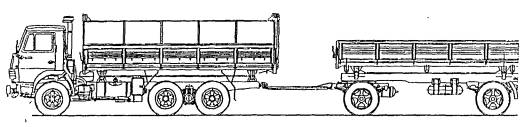 Автопоезд в составе самосвала КАМАЗ-55102 и прицепа СЗАП-85512Автомобиль-самосвал КАМАЗ-55102 предназначен для перевозки сельскохозяйственных и сыпучих строительных грузов. Кузов - металлический, прямоугольный с направлением разгрузки на две боковые стороны. На платформе могут устанавливаться дополнительные деревянные или надставные металлические борта. Спецификация АВТОМОБИЛЬ: Масса снаряженного автомобиля, кг...............8480 Грузоподъемность, кг........................................7150 Полная масса, кг...............................................15630 Угол подъема кузова, рад......................................50 Внутренние размеры кузова, мм...............5335´2320´635(+620) Объем кузова, куб.м.: - с основными бортами..........................................7,9 - с дополнительными деревянными бортами........................................10,12 - с надставными бортами.....................................15,8 Время подъема груженого кузова, с.......................18 Гидрооборудование: гидроцилиндр телескопический, трехступенчатый; насос шестеренчатый, номинальное давление на выходе, кгс/см2..........140 ПРИЦЕП: Масса перевозимого груза, кг...............................7300 Масса снаряженною прицепа, кг..........................4200 Объем платформы, куб.м.........................................7,9 Полная масса прицепа, кг...................................11500 Разгрузка................................на две боковые стороны Масса перевозимого автопоездом груза, кг......14450 Максимальная скорость, км/ч...................................80 Базовое шасси: Модель....................................................КАМАЗ-53205 Двигатель: Модель.......................................................7403 (740.11) Тип.....................................дизельный с турбонаддувом Максимальная мощность, л.с. (кВт), при 2600 (2200) об/мин...................260 (191), 240 (176) Изготовитель: ОАО «НЕФАЗ» г.Нефтекамск