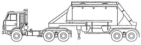 Автомуковоз ТЦ-21,2 (тягач КАМАЗ-54115 6×4)Полуприцеп - цистерна предназначена для бестарной перевозки сыпучих, пищевых проектов (мука, отруби, комбикорм и т.д.) по автомобильным дорогам I-III категорий условий эксплуатации. Выгрузка материала осуществляется при помощи сжатого воздуха, подаваемого от компрессора, установленного на раме полуприцепа. Возможна установка компрессора на тягаче с приводом от коробки мощности. Спецификация Модель..................................................ТЦ-21,2 Полезный объем цистерны, куб. м...........24,4 Масса перевозимого груза, т (g = 0,65 т/м3)................................16,0 Производительность пневмовыгрузки т/куб.м............................0,35 Дальность подачи материала, м..................50 в т.ч. на высоту, м.........................................17 Масса снаряженного полуприцепа, кг........................................6500 Габаритные размеры полуприцепа, мм: длина........................................................10300 ширина.......................................................2500 высота........................................................3600 Максимальная скорость, км/час..................80 Тягач: Модель....................................КАМАЗ-54115 Двигатель: Модель...........................................7403 (740.11) Тип........................дизельный с турбонаддувом Максимальная мощность, л.с. (кВт), при 2600 (2200) об/мин......260 (191), 240 (176) Изготовитель: ЗАО «БЕЦЕМА» г. Красногорск