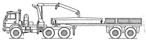 Автопоезд с ГПМ (шасси КАМАЗ-43101 6´6)Автопоезд предназначен для загрузки, разгрузки, транспортировки, раскладки и монтажа: стальных, металлополиэтиленовых и полиэтиленовых труб диаметром 57-114 мм и длиной до 13 м.; - опор линий электропередач; - строительных материалов, в том числе и сыпучих. Спецификация Гидроманипулятор........................МКС-5531А Полуприцеп..................................ЧМЗАП-9907 Полная масса автопоезда, кг....................25200 Снаряженная масса тягача, кг...................9570 Снаряженная масса полуприцепа, кг........5530 Масса перевозимого груза, кг..................10100 Максимальный грузовой момент г/манипулятора, тм....................................10,35 Грузоподъемность, т.: - на внутренней подвеске, вылет 1,83м.......5,0 - с основной стрелой на вылете 4,5 м..........2,3 - с основной стрелой на вылете 7,8 м..........1,3 Габаритные размеры, мм: - длина........................................................15000 - ширина.......................................................2500 - высота........................................................3700 Базовое шасси: Модель.......................................КАМАЗ-43101 Двигатель: Модель...............................................7403 (740.11) Тип............................дизельный с турбонаддувом Максимальная мощность, л.с. (кВт), при 2600 (2200) об/мин.........260 (191), 240 (176) Изготовитель: ООО «Автотрейд» г. Набережные Челны
