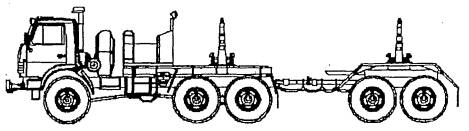 Автопоезд-трубовоз 4426 (шасси КАМАЗ-43101 6´6)Автопоезд-трубовоз гидромеханизированный предназначен: Для перевозки длинномерных грузов (труб, трубобуров и т.д.) по дорогам без твердого покрытия, по пересеченной местности с механизированной погрузкой и разгрузкой путем подтягивания груза тросами по наклонным канатам. Привод тяговых лебедок -гидравлический, имеющий ряд преимуществ: - отсутствие опасного для обслуживающего персонала высокого напряжения (400 В) - возможность плавного бесступенчатого регулирования тягового усилия при погрузочных работах. Спецификация Модель................................................................4426 Снаряженная масса, кг....................................13175 Масса перевозимого груза, кг........................10000 Полная масса автопоезда, кг..........................23475 Наибольшая масса одновременно погружаемого груза, кг............3000 Длина тягового каната лебедки, м........................25 Скорость погрузки средняя, м/сек.......................0,2 Длина перевозимого груза, м.............................7-13 Габаритные размеры, мм: - длина....................................................12480-17260 - ширина..............................................................2500 - высота...............................................................3090 Максимальная скорость, км/ч..............................80 Базовое шасси: Модель..........................................КАМАЗ-43101 Двигатель: Модель...............................................7403 (740.11) Тип............................дизельный с турбонаддувом Максимальная мощность, л.с. (кВт), при 2600 (2200) об/мин..........260 (191), 240 (176) Изготовитель: ООО «АСТЕЙС» г.Набсрежные Челны