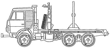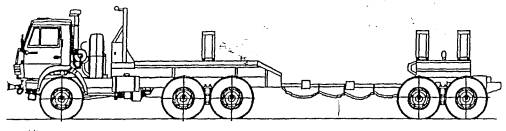 Автопоезд-плетевоз 44261 (шасси КАМАЗ-43101 6´6)Автопоезд-плетевоз ПВ-96 предназначен: для перевозки труб и плетей диаметром 530-1420 мм, длиной до 36 м, по дорогам с твердым покрытием, грунтовым и труднопроходимым, включая участки бездорожья. Прицеп-роспуск плетевоза оборудован тормозами и внешними световыми приборами. В транспортном положении роспуск может перевозиться на раме тягача. Коники тягача и прицепа-роспуска оборудовании переставными стойками-упорами и увязочными механизмами, обеспечивающими надежное крепление труб. От продольного перемещения труб имеются стопорные устройства. Спецификация Модель.........................................................44261 Снаряженная масса, кг...............................12600 Грузоподъемность, кг.................................12000 Полная масса автопоезда по дорогам, кг : I-IV категории.............................................24600 V категории и бездорожью........................20600 Длина перевозимых труб, м............................12 Длина перевозимых плетей, м........................36 Погрузочная высота, мм...............................1880 Распределение нагрузки на дорогу, кг: - через передний мост..................................4915 - через заднюю подвеску............................10185 - через тележку роспуска...........................10000 Габаритные размеры, мм: - длина.................................................7650-40000 - ширина.........................................................2500 - высота...........................................................3090 Максимальная скорость, км/ч...........................80 Базовое шасси: Модель..................................КАМАЗ-43101 Двигатель: Модель....................................................7403 (740.11) Тип................................дизельный с турбонаддувом Максимальная мощность, л.с. (кВт), при 2600 (2200) об/мин ............ 260 (191), 240 (176) Изготовитель: ООО«АСТЕЙС» г.Набережные Челны