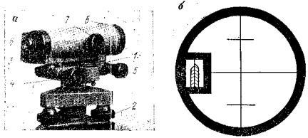 Рис. 1. Нивелир Н3 и поле зрения его визирной трубы. Цена деления цилиндрического уровня Н3 равна 15" на 2 мм, расстояние минимального визирования - 2 м (табл. 1). Инструмент имеет современный вид, грубая установка нивелира по круглому уровню 1 производится подъемными винтами 2. Технические характеристики нивелиров