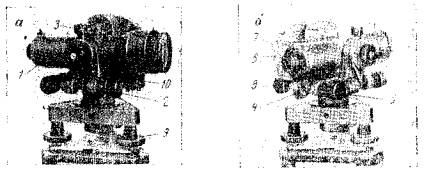 где L - длина хода в километрах. Отсюда предельная ошибка определения превышения на станции не должна быть больше +10, 20 и 30 мм при расстояниях от нивелира до рейки 25, 75 и 150 м соответственно. Однако методами технического нивелирования могут определяться превышения и с меньшей точностью: так, на изысканиях трасс автодорог требуется производить высотные измерения с ошибками не более +100 мм на 1 км и т.д. Часто меньшей, чем 50 мм на 1 км, точности требуют работы на строительных площадках (при оценке объемов работ, предварительной передаче отметок в котлован и т.д.). Однако методика измерений и инструменты применяются такие, какие приняты для технического нивелирования. § 2. Инструменты для технического нивелированияТехническое нивелирование производится при помощи нивелиров, реек, костылей, башмаков. Нивелиры Согласно ГОСТ 10528-69 для технического нивелирования предназначены нивелиры НТ, НТС, НЛС; кроме того, возможно применение нивелиров, используемых для работ более высокого класса точности: НС4, Н3 и равных им по точности нивелиров прежних выпусков НВ-1, НГ и других инструментов, выпускаемых предприятиями СССР. Возможно также и применение нивелиров, изготовленных в ГДР: Ni060, Ni030, Ni025, Ni050 и Венгрии: NiE1(2), NiB3(4), 5(6) и др. Из всех инструментов для технического нивелирования оригинальным устройством отличается нивелир отечественного производства НЛ-3, позволяющий нивелировать как горизонтальным, так и наклонным визирным лучом. На основе этого инструмента по ГОСТ 10528-69 намечен выпуск нивелира НЛС. Нивелир Н3 (рис. 1, а) является глухим нивелиром с элевационным винтом. Назначение нивелира - производство нивелирования III и IV классов; с успехом применяется он и при техническом нивелировании. Им возможно определение превышении со средними квадратическими ошибками +4 мм на 1 км и ±1,5 мм па станции при расстоянии до реек 75 м.