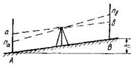 где n - число делений уровня, на которое переместился пузырек его между отсчетами по рейке a1 и a2. При этом делается не менее трех установок пузырька цилиндрического уровня в разных местах шкалы с одновременными отсчетами по рейке. Если на ампуле уровня нет делений, то к пей приклеивается полоска бумаги с предварительно нанесенными делениями через 2 мм. У инструментов с компенсатором исследуется правильность работы компенсатора в пределах его действия вдоль линии визирования и перпендикулярно к ней. Об исправности компенсатора судят по постоянству отсчетов по рейке, взятых вначале при среднем положении пузырька установочного уровня, а затем при смещении его подъемными винтами вперед, назад и в стороны по отношению к линии визирования на величину диапазона действия компенсатора (с учетом цены деления уровня). Если отсчеты при этом меняются более чем на ошибку отсчитывания, то нивелир следует отправить в мастерскую для ремонта. При исследовании нивелира НЛ-3, кроме увеличения трубы и цены деления уровня, определяется коэффициент K высотомера. Для этого на местности кольями закрепляют две точки на расстоянии 100 - 120 м с превышением h = l - 2 м. Превышение вначале определяют многократно геометрическим нивелированием из середины хорошо выверенным инструментом, а затем также многократно - исследуемым нивелиром НЛ-3, причем среднюю нить сетки необходимо наводить на одинаковые отсчеты. Определив средние отсчеты aср и bср по рейкам, вычисляют коэффициент как