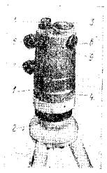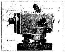 Рис. 7. Нивелир NiB5 и поле зрения его визирной трубы. Как видно из табл. 1, инструмент достаточно портативен (масса 2,3 кг) и имеет хорошие качества: средняя квадратическая ошибка установки визирной оси компенсатором в горизонтальное положение ±0",4 с диапазоном работы ±8'. Изображение пузырька круглого уровня 3 (см. рис. 7, а), расположенного в верхней части корпуса нивелира трубы, передается в поле зрения трубы (рис. 7, б). Нивелир может применяться при проложении нивелирных ходов III и IV классов, нивелировании трасс линейных сооружении, разбивках на строительной площадке и при городских съемках. Предприятием MOM выпускаются также нивелиры: NiB6, по конструкции аналогичный представленному, но без горизонтального круга; NiB3 и NiB4 - варианты без передачи изображения пузырька круглого уровня в поле зрения трубы (NiВ3 - с горизонтальным кругом). Нивелир NiE1(рис. 8) Венгерского оптического завода (Будапешт) позволяет, по данным предприятия-изготовителя, определять превышения со средней квадратической ошибкой ±20 мм на 1 км и предназначен в основном для производства нивелирных работ на строительной площадке. Нивелир снабжен компенсатором с пределами работы ±30', металлическим горизонтальным кругом 1 со средней квадратической ошибкой отсчета порядка 0°,1 и сферическим шарниром 2 вместо подъемных винтов. Для установки оси вращения нивелира в отвесное положение зажимной винт 4 ослабляется и наклоном верхней части нивелира от руки пузырек круглого уровня 3 приводится на середину.