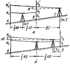 Рис. 10. Схема поверки главного условия геометрического нивелирования. На точках А и В устанавливают рейки, затем строго на середине между ними устанавливают нивелир (Ст. 1) и производят отсчеты по рейкам a1 и b1 после чего нивелир ставят в точке С (Ст. 2) и производят еще два отсчета a'2 и b'2. При этом a1 - b1 = h, a'2 - b'2 = h'. Превышение h, определенное со станции 1, свободно от влияния ошибки за несоблюдение исследуемого условия и тогда h - h' = ∆, а угол i" между визирной осью и осью уровня вычислится как i" = 10·∆. Исправление угла i" нивелира производится после установки элевационным винтом на рейке в точке B отсчета b2 = b'2 + ∆ и последующим приведением пузырька цилиндрического уровня на середину юстировочными винтами. Эту поверку можно производить также нивелированием на равных и значительно не равных визирных плечах. На местности устанавливают две рейки на расстоянии 50 - 60 м (рис. 10, б); установив нивелир на середине, берут два отсчета a1 и b1 по рейкам и определяют превышение h1 = a1 - b1. Затем устанавливают нивелир на расстоянии минимального визирования от одной из реек и определяют превышение h2= a2 - b2. Сравнивая результаты нивелирования и считая отсчет b2 безошибочным, получают ∆h = h1 - h2. Для юстировки главного условия элевационным винтом на дальней рейке устанавливают отсчет, исправленный на величину ∆h. Затем пузырек цилиндрического уровня приводят на середину юстировочными винтами. Поверка, а при необходимости и юстировка повторяются, пока ∆h будет не более ±4 мм. Поверки и юстировки нивелиров с компенсатором Поверки круглого уровня и сетки нитей производятся аналогично поверкам уровенных нивелиров. Главное условие нивелиров с компенсатором формулируется так: в пределах работы компенсатора визирный луч зрительной трубы должен быть горизонтальным. Поверка делается так же, как и поверка главного условия уровенных нивелиров (см. рис. 10). Юстировка производится установкой исправленного отсчета при помощи винтов сетки; у нивелира NiE1 нужный отсчет устанавливается вращением оправы 8 (см. рис. 8) оптического клина после ослабления стопорного винта 9. Поверка и юстировка нивелира НЛ-3 У нивелира НЛ-3 в полевых условиях производят две поверки. 1. Поверка круглого уровня - аналогична поверкам уровенных нивелиров. 2. Поверка главного условия: при горизонтальном положении оси цилиндрического уровня и визирной оси зрительной трубы высотный штрих должен совпадать с горизонтальной нитью сетки. Поверка делается двойным нивелированием вперед при расстоянии между точками 50 - 60 м и наведении средней нити сетки на отсчет, равный высоте инструмента. Пусть ia, ib - высота инструмента, a, b - отсчеты по высотомерному штриху в точках А и В соответственно. Тогда ошибка x в отсчете по рейке из-за несоблюдения главного условия вычислится по формуле