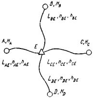 Возможно также распределение невязки пропорционально длине хода между точками. При этом вначале находят ∆1км - поправку на 1 км делением всей невязки на всю длину хода, а затем вычисляют поправки на секции пропорционально их длинам. Сумма всех поправок должна быть равна невязке с обратным знаком ∑∆ = -fh. Исправленные превышения вычисляются сложением средних превышений с поправками на станции, причем должно быть ∑hиспр = ∑hср + ∑∆. Отметки всех связующих точек вычисляются последовательным прибавлением превышений к отметке задней точки. Контроль вычислений состоит в равенстве суммы исправленных превышений разности отметок конечной и начальной точек на странице ∑hиспр = Hк -Hн. Заключительный контроль вычислений по всему ходу состоит в том, что последняя вычисленная отметка должна равняться известному ее значению. Окончательная обработка журналов нивелирования для построения профилей ведется в самом журнале (см. табл. 3). Отметки связующих точек считают аналогично приведенному в табл. 5. Для вычисления отметок промежуточных точек на станции вначале находят отметку горизонта инструмента (ГИ) прибавлением заднего отсчета по черной стороне к отметке задней точки (19) = (20) + (8). Отметки промежуточных точек получают вычитанием соответствующих отсчётов по рейке из отметки ГИ (21) = (19)-(9) и т. д. Обработку журнала нивелирования по односторонним рейкам с одним горизонтом инструмента можно вести с введением поправок в вычисленные отметки (см. табл. 4). При этом оценку качества нивелирования производят обычным способом, а отметки всех точек вычисляют через горизонт инструмента. Постраничным контролем правильности вычислений является равенство разности последней и первой отметок на странице в графе отметки вычисленные и суммы вычисленных превышений. Затем производится распределение невязки по ходам по тому же принципу, что и при двусторонних рейках, но исправляются уже вычисленные отметки с таким расчетом, чтобы при равномерном увеличении поправки последняя отметка была исправлена на величину полной невязки. Все отметки промежуточных точек на станции исправляются на поправку, вводимую в отметку задней точки на станции. Заключительным контролем правильности вычислений по ходу является равенство вычисленного значения отметки последней точки ее истинному значению. Уравнивание систем линий технического нивелирования производится способом узлов. Порядок работы при этом рассмотрен на случае системы с одной узловой точкой. Вначале составляют немасштабную схему нивелирных ходов, где указывают отметки Hi исходных реперов, длины Li ходов и число ni станций от реперов до узловой точки, суммы измеренных превышений hi по ходам (рис. 11). Затем вычисляют веса нивелирных линий
