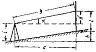 Рис. 26. Схема определения расстояний по вертикальному базису. Полевые работы при этом заключаются в измерении углов наклона на концы вертикального базиса, в качестве которого может быть применен любой базисный жезл или рейка комплекта ОТД (и тогда работы ведутся трехштативным методом). Возможно также применять рейку комплекта ДД-3 или изготовить базис нанесением марок на обычную деревянную нивелирную рейку. Последнюю при этом необходимо снабдить круглым уровнем с приспособлением для поверки, упорами для установки ее и наконечниками для точного центрирования рейки. Все принадлежности для рейки, кроме наконечника, можно взять из комплекта ДД-3. Горизонтальные проложения вычисляются по формуле (см. рис. 26) В табл. 11 дан образец ведения полевого журнала с определением расстояний по вертикальному базису постоянной длины. Теодолит ОТШ, вертикальная рейка, постоянный базис 2 м