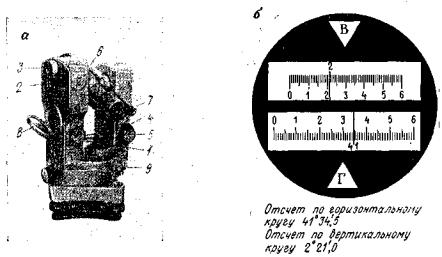 Рис. 13. Теодолит Т30 и поле зрения его отсчётного микроскопа. Порядок центрирования инструмента с оптическим центриром при наличии нитяного отвеса следующий. Вначале центрируют инструмент нитяным отвесом с точностью 1 - 2 см. Затем, убрав отвес или сняв его совсем, горизонтируют инструмент подъемными винтами, глядя в окуляр оптического центрира (у Т30 - в окуляр зрительной трубы при отсчете по вертикальному кругу, равном МО +90°), передвижением инструмента по головке штатива без разворотов. После этого закрепляют становой винт и подправляют горизонтирование. Если центрирование при этом будет нарушено на недопустимую величину, необходимо уточнить его вновь передвижением теодолита по головке штатива. При работе без нитяного отвеса инструмент вначале грубо центрируют на глаз с точностью 5 - 10 см. Затем исполнитель, глядя в окуляр центрира и передвигая две ножки штатива, визирует центрир на точку и вдавливает башмаки штатива в грунт, стараясь привести пузырек уровня при алидаде горизонтального круга на середину. Более точное горизонтирование производится выдвижением ножек штатива (до +2 - 3 делений уровня), а окончательное - подъемными винтами. Некоторое нарушение центрировки при этом устраняется передвижением инструмента по головке штатива без разворота (при ослабленном становом винте). Грубое наведение визирной трубы на цель производится при помощи визиров 5, расположенных с двух сторон трубы. При работе с теодолитом Т30 необходимо помнить, что в основании подъемных винтов поставлены стальные шарики, которые могут утеряться, если ослабить натяжение плоской становой пружины винтами 7. Малый вес теодолита, удобное размещение деталей, хорошие оптические качества, простота отсчета по штриховому микрометру 8 делают этот прибор незаменимым для разбивок в условиях строительных площадок, при прокладывании тахеометрических ходов в сложных условиях. Теодолит Т10 (рис. 14, а) - оптический повторительный угломерный инструмент, предназначенный для измерения горизонтальных и вертикальных углов при создании аналитических сетей и полигонометрии 1 и 2 разрядов; он может быть с успехом применен и при работах низшей точности, в том числе и при прокладывании высотных теодолитных ходов для измерения углов со средними квадратическими ошибками из одного приема +7". Теодолит снабжен цилиндрическими уровнями при алидаде горизонтального 1 и вертикального 2 кругов; изображение концов уровня при алидаде вертикального круга рассматривается через лупу 3. Соосно расположенные зажимные 4 и наводящие 5 винты, размещение оптического отвеса в алидадной части, наличие визиров 6 для предварительного визирования на цель, шкаловой микроскоп 7 для отсчитывания с зеркалом 8, возможность одновременного наблюдения изображений горизонтального и вертикального кругов (рис. 14, б) делают инструмент удобным в обращении.