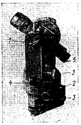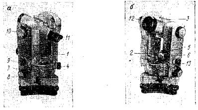 Теодолит Т5 снабжен компенсатором при вертикальном круге, который автоматически компенсирует наклон оси вращения теодолита при измерении вертикальных углов. Для грубой установки инструмента в рабочее положение имеется круглый уровень 1; точная установка производится по цилиндрическому уровню 2. Предварительное наведение трубы на цель делается при помощи визиров 3, укрепленных с обеих сторон трубы. Перестановка лимба при измерении углов производится при помощи специальной головки с пружинным предохранителем 4 на алидаде горизонтального круга. Наводящие и зажимные винты трубы 5, 6 и алидады горизонтального круга 7, 5 размещены соосно; оптический центрир размещен в алидадной части 13, что значительно облегчает его применение и поверку. Головка фокусировочного винта 10 трубы для удобства вынесена на стойку трубы. Поле зрения отсчетного шкалового микроскопа 11 освещается зеркалом 12 и аналогично представленному на рис. 14, б. Теодолит Т5, как и Т10, предназначен для создания аналитических сетей и полигонометрии 1 и 2 разрядов, но с успехом может быть применен при проложении высотных теодолитных ходов, особенно в комплекте с дальномерными насадками ДН-04 и ДНР-06, позволяющими определять расстояния. По ГОСТ 10529-70 теодолит Т5 изготовляется в двух вариантах: Т5 с уровнем и Т5К с компенсатором при вертикальном круге. Кроме того, по ГОСТ 10529-70 теодолиты Т5 снабжены повторительной системой осей и защелкой для точной перестановки лимба при повторениях (как у теодолитов Т10). Теодолит Т2 (рис. 16, а) - точный оптический угломерный инструмент, предназначенный для измерения углов со средней квадратической ошибкой +3" из одного приема. Теодолит предназначен для производства работ при триангуляции и полигонометрии 3 и 4 классов, но с успехом может применяться также для прокладывания высотных теодолитных ходов.