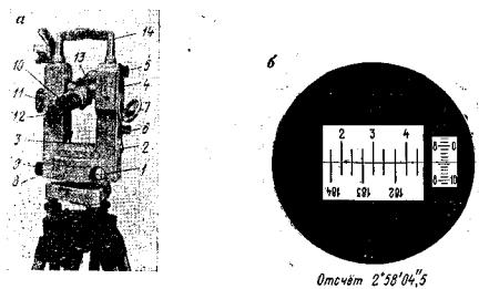 Рис. 16. Теодолит Т2 и поле зрения его отсчётного микроскопа. Инструмент имеет неповторительную систему осей; перестановка лимба осуществляется вращением головки барабана 1. Центрирование теодолита осуществляется оптическим центриром, окуляр 2 которого выведен на стойку трубы. Для установки инструмента в рабочее положение при алидаде горизонтального круга имеется цилиндрический уровень 3. Цилиндрический уровень 4 при алидаде вертикального круга размещен в стойке трубы, изображение концов его пузырька рассматривается через лупу поворотной призмы 5, а ось уровня приводится в горизонтальное положение вращением головки 6. Для освещения отсчётных шкал микроскопа имеется поворотное зеркало 7. Зажимной 8 и наводящий 9 винты алидады (а также и трубы) расположены соосно. Для отсчитывания через микроскоп 10 применен двусторонний клиновой оптический микрометр с подвижной шкалой, барабан которого 11 выведен на стойку трубы. Отсчет по микрометру производится после точного совмещения штрихов лимба, расположенных через 180°, вращением барабана микрометра (рис. 16, б). При совмещении необходимо учитывать все деления, попадающие в поле зрения. Отсчет направления складывается из отсчета по лимбу по подписанному делению (расположенному в центре или первому слева) плюс число десятков минут между этим делением и соответственно ему расположенным через 180° и плюс отсчет по штриху микрометра. При горизонтальном положении оранжевой полосы на рукоятке 12 (см. рис. 16, а) в поле зрения микроскопа вводится изображение горизонтального круга (двойные штрихи), при отвесном - вертикального, имеющего желто-зеленый фон и одинарные штрихи круга. Для грубого визирования на цель имеются визиры 13. Инструмент снабжен специальной ручкой - мостиком 14 для переноски его, крепления буссоли и электрифицированной вешки при работе ночью (теодолит может поставляться с приспособлениями для электрического освещения и без него). Теодолит Theo 020 (рис. 17) народного предприятия «Карл Цейсе» (Иена, ГДР) по своим техническим данным близок к теодолиту Т5К. Он дает возможность определять горизонтальные и вертикальные углы со средними квадратическими ошибками из одного приема ±4". Инструмент имеет повторительную систему осей; для перемещения лимба с алидадой имеется защелка, что позволяет измерять горизонтальные углы методом повторений. Теодолит имеет зажимные винты 1, 2 рычажного типа, наводящие 3 обычного типа и оптический отвес, окуляр 4 которого вынесен на алидаду.