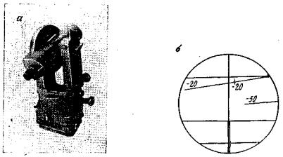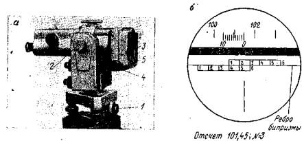 Рис. 14. Теодолит Т10 и поле зрения его отсчётного микроскопа. Для измерения горизонтальных углов методом повторений инструмент снабжен удобной защелкой 9 для перестановки лимба горизонтального круга вместе с алидадой теодолита. При центрировании инструмента резкого изображения сетки отвеса добиваются вращением диоптрийного кольца окуляра, а фокусирования оптического отвеса на точку - выдвижением окулярной трубки. Теодолит может быть укомплектован ориентир-буссолью и цилиндрическим уровнем для трубы, укрепляемым на место одного из визиров, что позволяет производить, при необходимости, нивелирование горизонтальным лучом. Согласно ГОСТ 10529-70 этот теодолит относится по точности к классу Т5. Теодолит Т5 (рис. 15, а, б) - оптический угломерный инструмент с неповторительной системой осей и шкаловым микроскопом для отсчитывания направлений. Инструмент позволяет определять горизонтальные углы со средними квадратическими ошибками из одного приема не более +7".